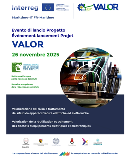 Kick-off meeting del progetto Interreg Marittimo IT-FR VALOR - Valorizzazione del riuso e trattamento dei rifiuti da apparecchiature elettriche ed elettroniche, che si propone di creare di un modello migliorativo di economia circolare per il riutilizzo, il riciclo e il recupero efficiente delle materie prime contenute nei dei Rifiuti Elettrici ed Elettronici (RAEE), riducendo la dipendenza da risorse vergini e migliorando la sostenibilità complessiva.