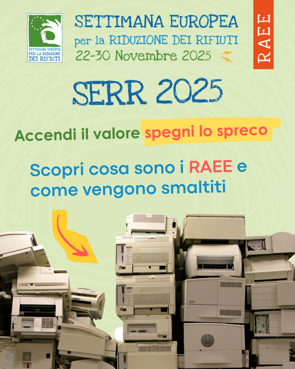 I contenuti si concentrano sul focus tematico annuale della campagna, ovvero per quest’anno i RAEE, e mirano ad informare su cosa sono questa tipologia di rifiuti, come riconoscerli e dove correttamente smaltirli.
