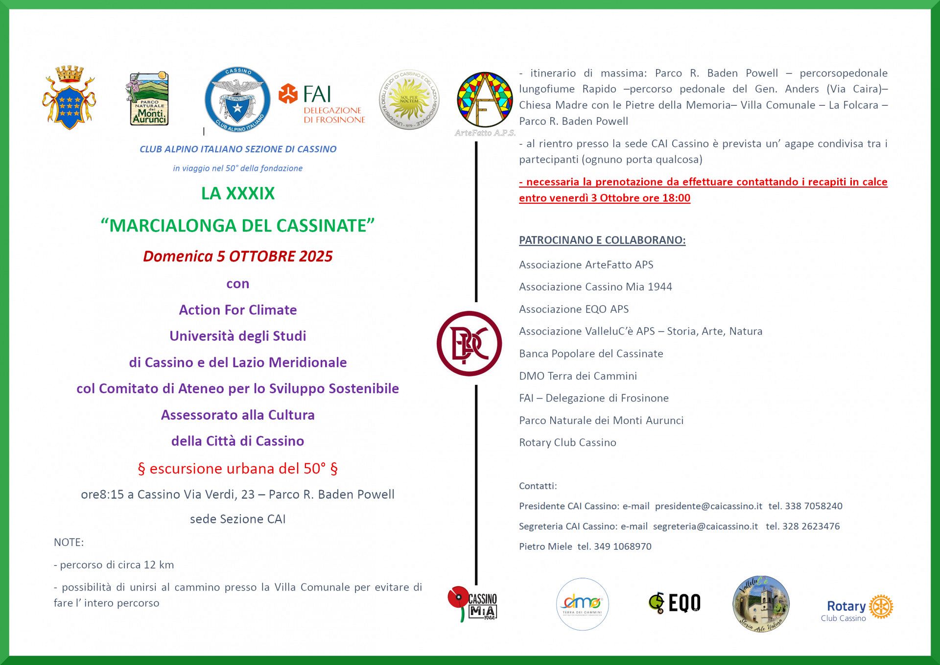 CAI - Sezione di Cassino, Associazione ArteFatto APS, Associazione Cassino Mia 1944, Associazione EQO APS, Associazione VallulùC'è APS - Storia, Arte, Natura, Banca Popolare del Cassinate, DMO Terra dei Cammini, FAI - Delegazione di Frosinone, Parco Naturale dei Monti Aurunci, Rotary Club Cassino