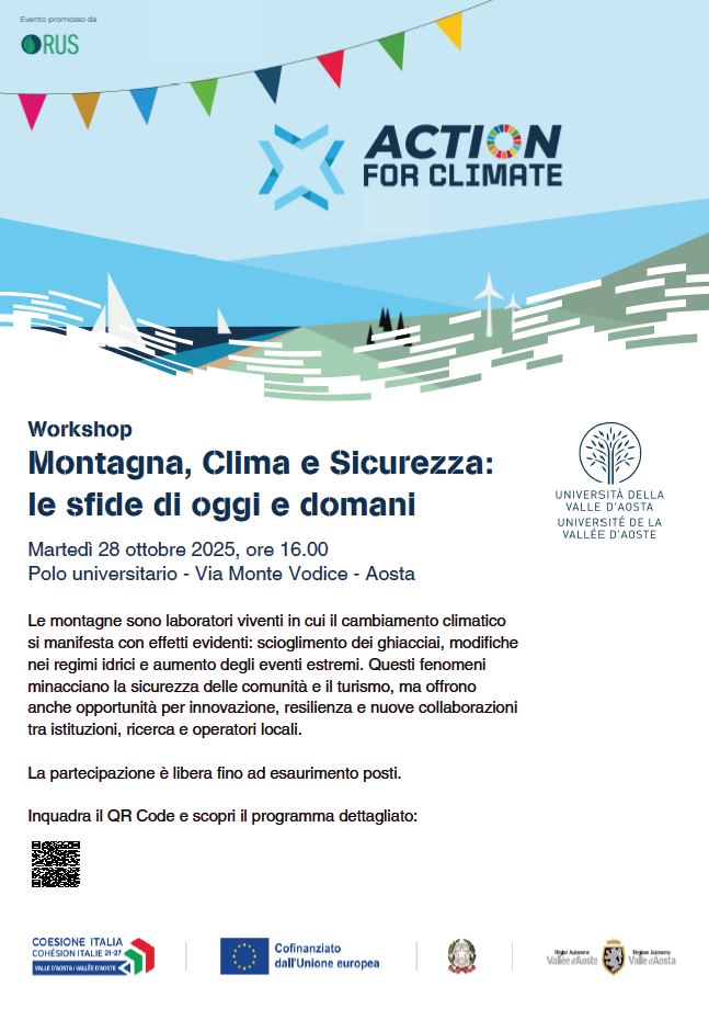 In questo contesto si inserisce il workshop “Montagna, Clima e Sicurezza: le sfide di oggi e domani”, promosso dall’Università della Valle d’Aosta nell’ambito delle iniziative della Rete delle Università per lo Sviluppo Sostenibile (RUS) – Action for Climate. L’incontro nasce con l’obiettivo di offrire uno spazio di dialogo aperto e multidisciplinare, nel quale il mondo accademico, gli enti di ricerca, le istituzioni e i professionisti possano confrontarsi su come affrontare i cambiamenti in atto e immaginare insieme strategie efficaci per il futuro delle Alpi.